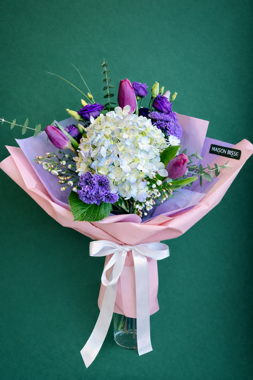 Purple Bloom is a graceful bouquet featuring soft hydrangea, elegant purple chrysanthemums, and fresh tulips, gently accented with complementary greenery. The harmonious blend of textures and delicate purple tones conveys warmth, serenity, and refined beauty—perfect for expressing love, gratitude, or celebrating a special moment.